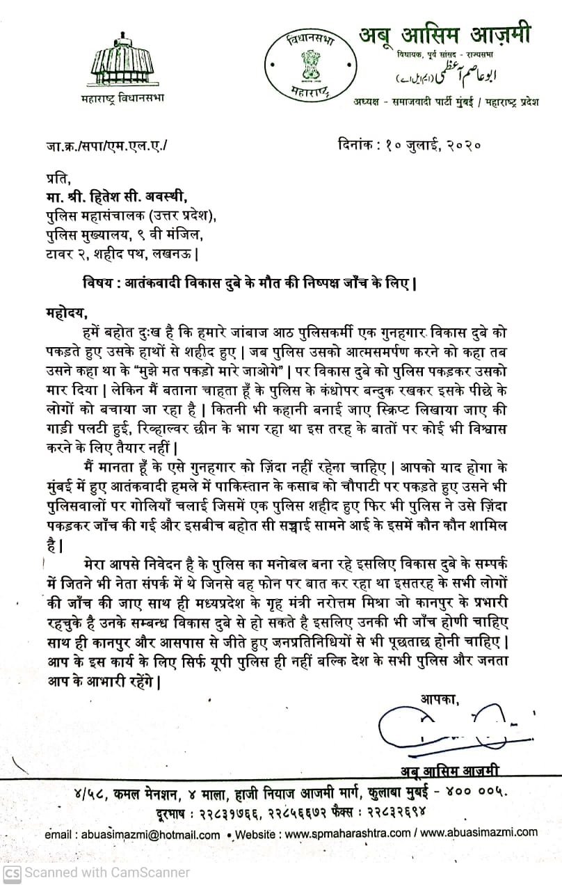 उत्तर प्रदेश पोलिस महासंचालक को पत्र देकर विकास दुबे को साथ देनेवाले सभी साथियों की जांच करके कारवाई माँग की गई |